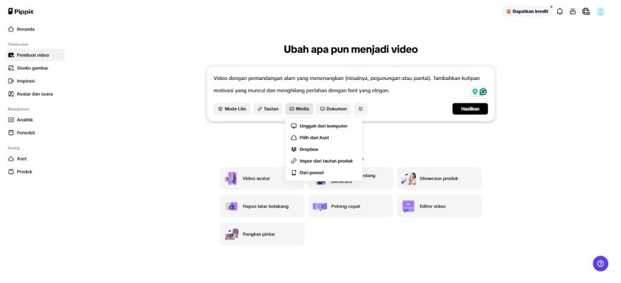 Generator video AI Pippit membangun video berdasarkan prompt dan media yang diunggah.