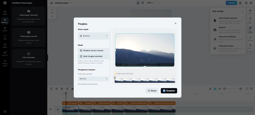 Masuk ke Smart Tools lalu pilih Auto Reframe. Tentukan Manual Crop atau Auto Reframe, lalu tekan Apply. Teks yang tidak diinginkan, baik berupa watermark, caption, atau tipografi akan dibersihkan. Jika ingin, klik Remove Background lalu aktifkan Auto Removal untuk menghapus latar yang berisi teks. Pilih "Background" untuk menambahkan warna solid, atau buka "Elements" untuk menaruh video stok di belakang kontenmu. Semua perubahan tetap sinkron saat kamu mengedit.
